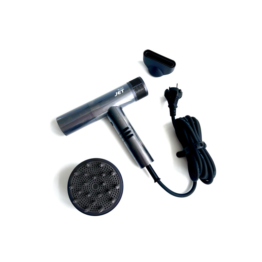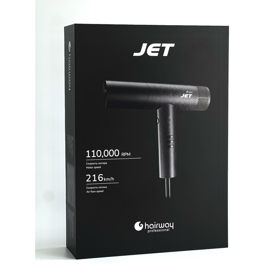 Фен Hairway Jet — це професійний інструмент для сушіння та укладання волосся, оснащений високошвидкісним безщітковим двигуном (BLDC) з цифровим управлінням. Завдяки потужності 2100 Вт та мотору змінного струму (AC), фен забезпечує стабільну роботу та високий рівень ефективності, що робить його ідеальним для використання в салонах та вдома. Функція холодного обдуву дозволяє фіксувати зачіску для довготривалого результату.