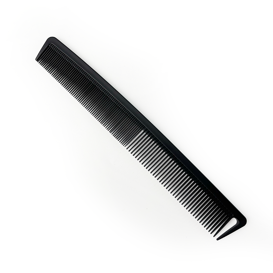 Карбоновий гребінець для стрижки з рідкими та частими зубцями з міцного, термостійкого та зносостійкого матеріалу. Зубці ідеально згладжені, що забезпечує легке ковзання по волоссю, не травмуючи його при розчісуванні. Карбон - дуже міцний матеріал і гребінці з нього практично не гнуться, що дає можливість краще контролювати їх у роботі.