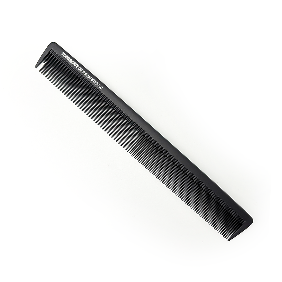 Комбінований гребінець з рідкими та частими зубцями з міцного, термостійкого та зносостійкого матеріалу. Зубці ідеально згладжені, що забезпечує легке ковзання по волоссю, не травмуючи його при розчісуванні. Карбон - дуже міцний матеріал і гребінці з нього практично не гнуться, що дає можливість краще контролювати їх у роботі.