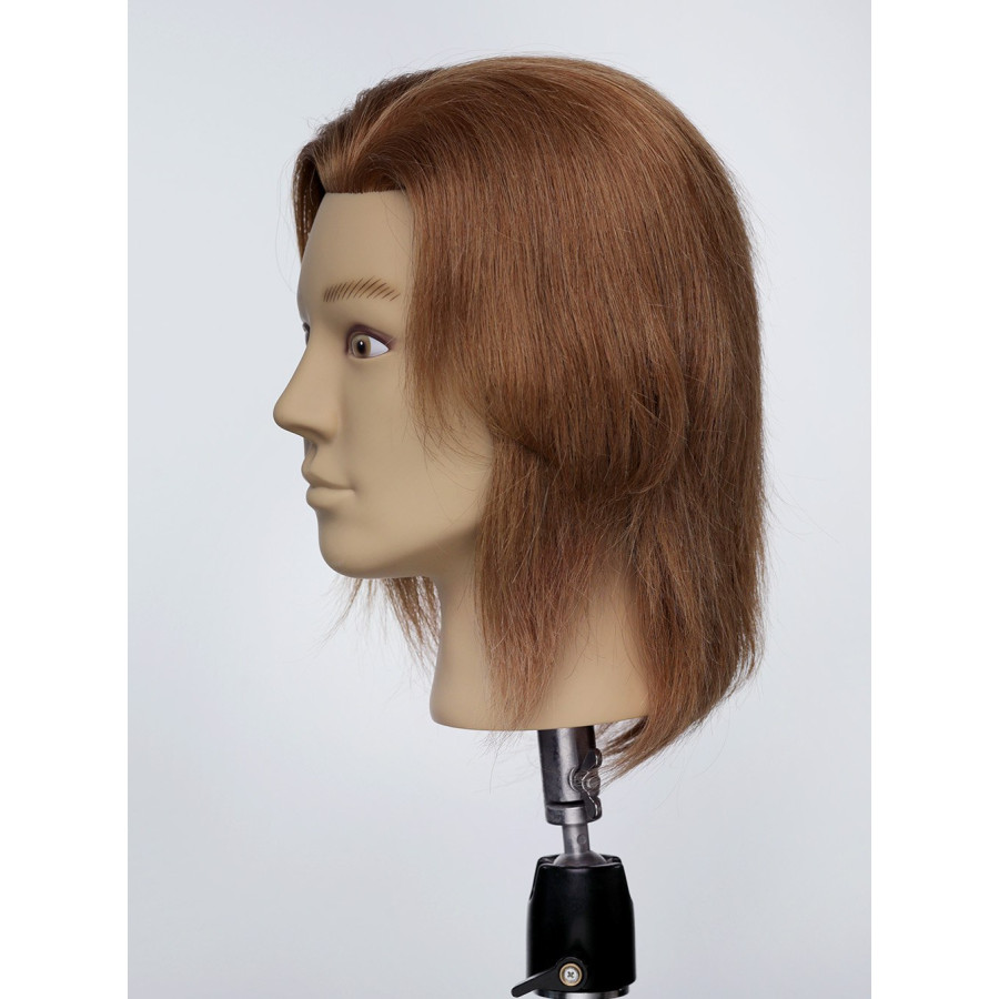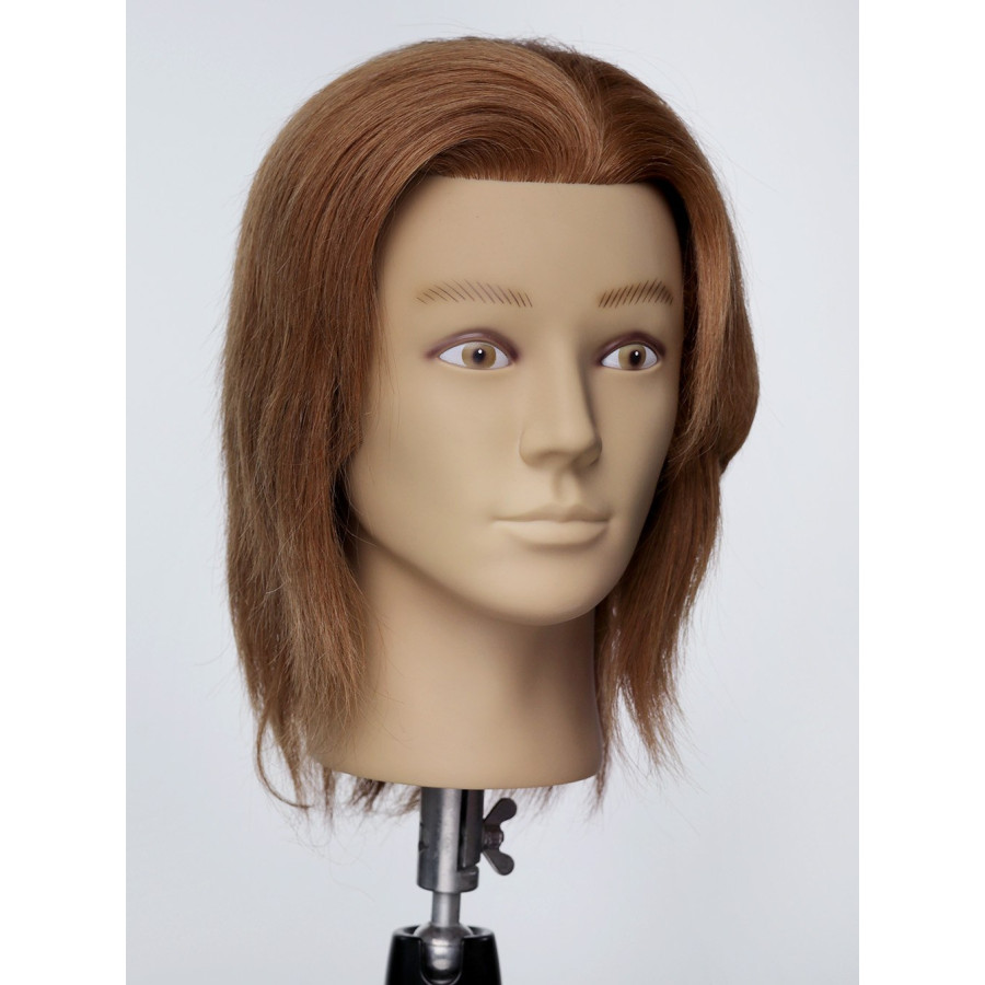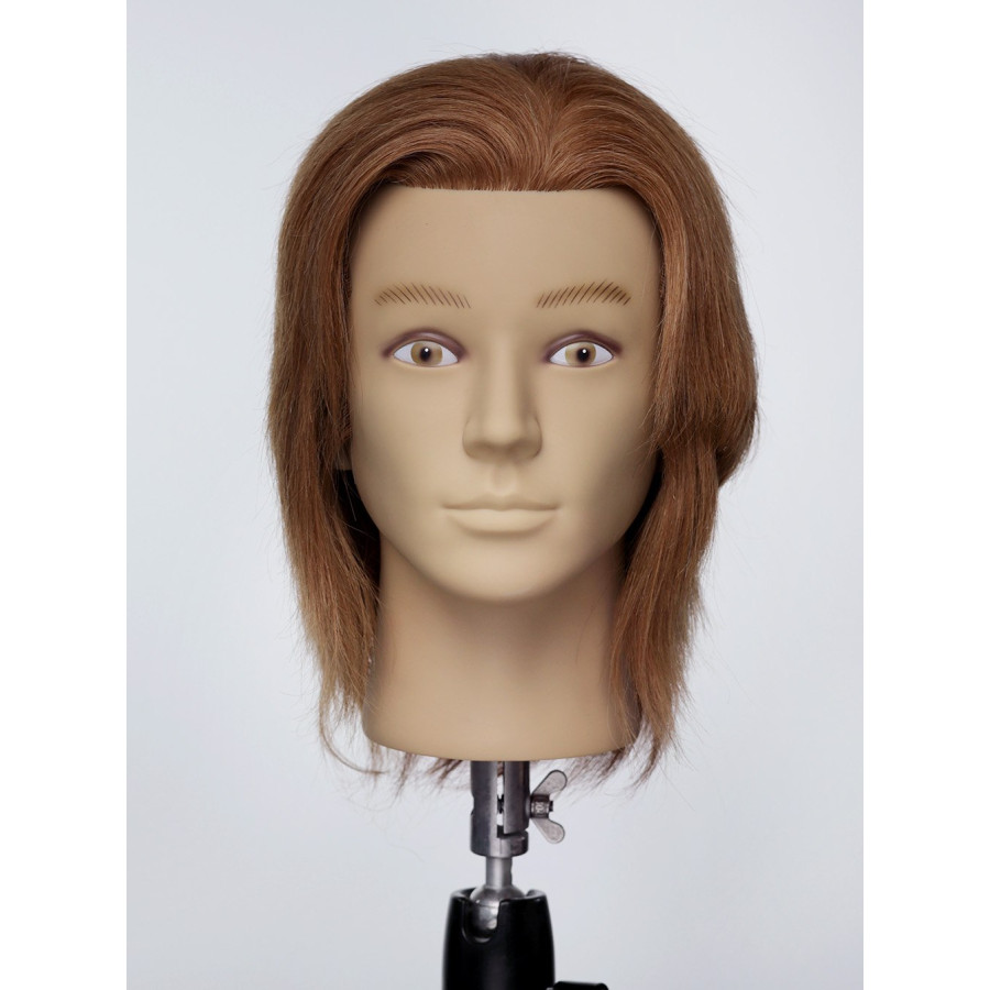 Манекен-голова чоловіча без бороди. Волосся на манекені світло русе, натуральне, рівномірно прошите, . Європейські риси обличчя. Ідеально підходить для відпрацювання стрижок та укладання волосся, Можна використовувати фен і праску, мити голову та використовувати засоби стайлінгу.