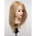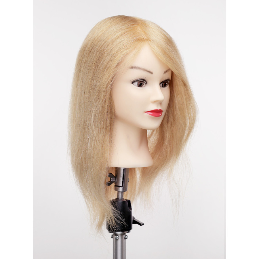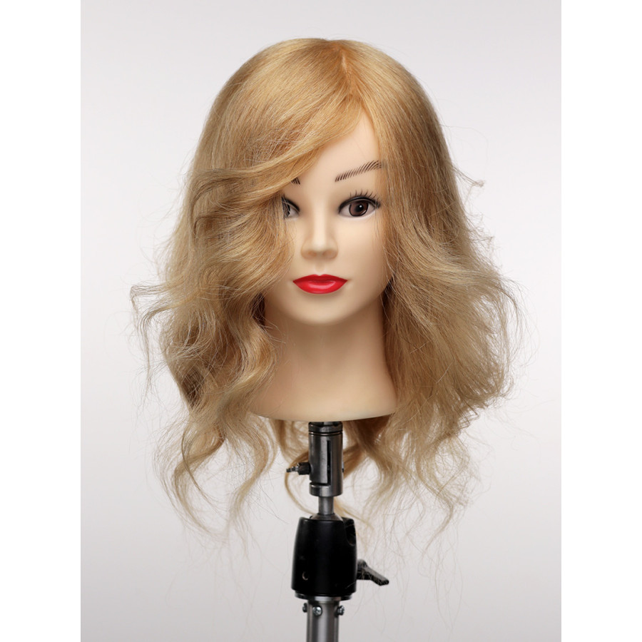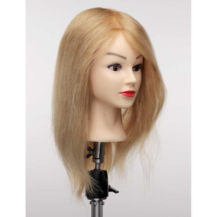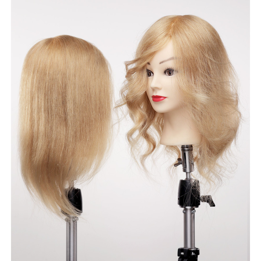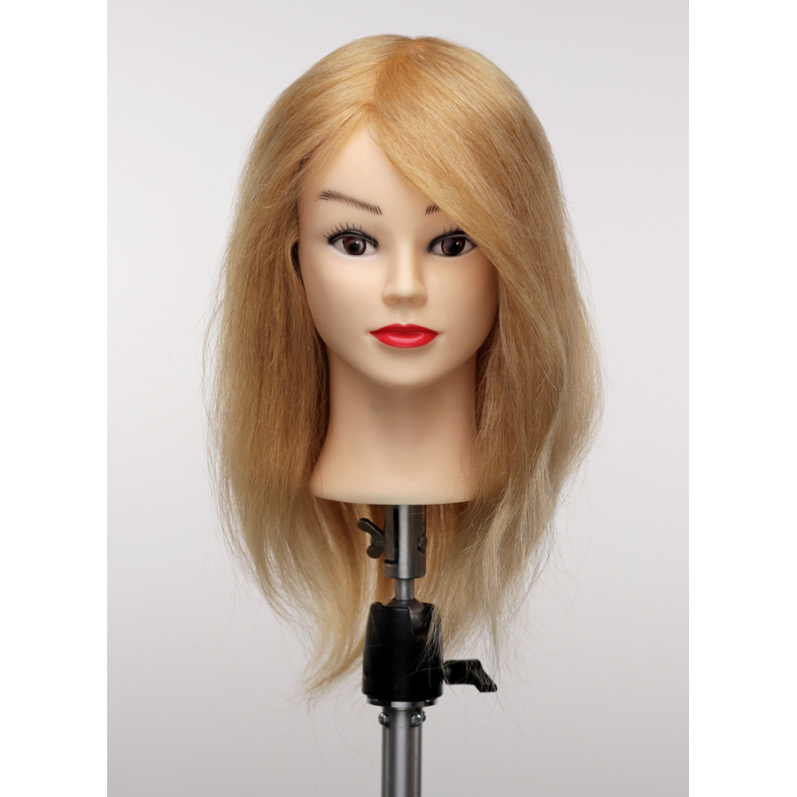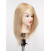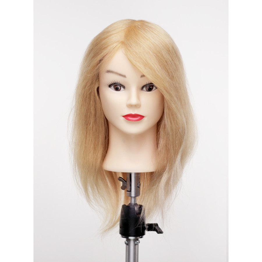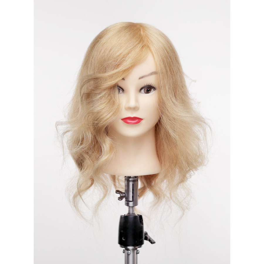 Жіноча манекен-голова Блонд зі 100% людським волоссям ідеально підходить для навчання стрижки та фарбування. Довжина волосся: 35 см.