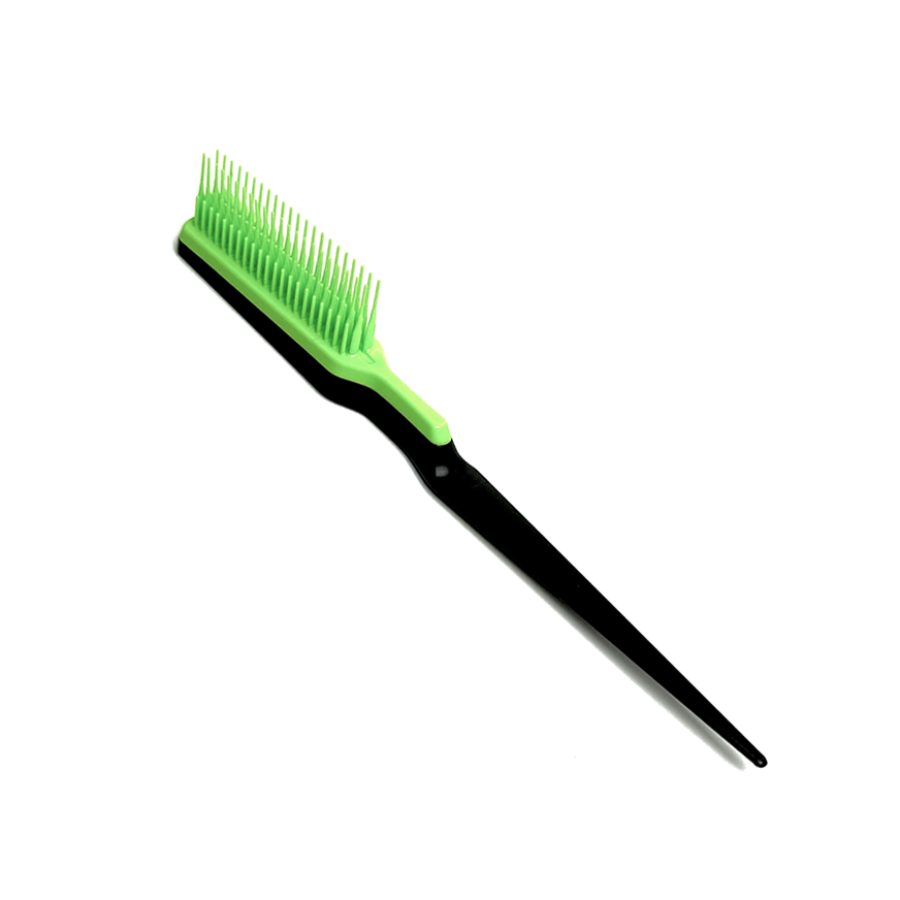 Расческа-страйпер для окрашивания и мелирования волос зеленого цвета. Подходит для мелкого мелирования на тонких прядях любой длины. Она бережно расчесывает сухие и мокрые волосы, точно выделяет прядь для мелирования. Имеет зубчики разной длины 30 мм и 12 мм и заостренный хвостик в ручке, разделяющей прядь. Выходит очень мелкое мелирование без швов и эффекта полосок. Щеткой легко можно выполнить плавные переходы, растяжку цвета и покраску другой техники. Расческа подходит как для домашнего использования, так и для профессионального. Изготовлена из прочного гипоаллергенного пластика.